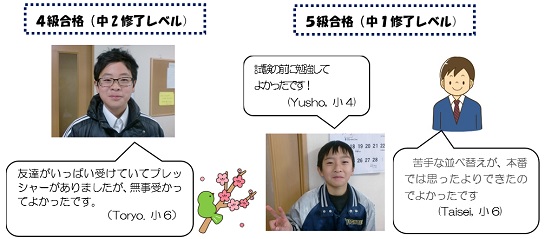 - 4級:友達がいっぱい受けていてプレッシャーがありましたが、無事受かってよかったです。(Toryo. 小6)