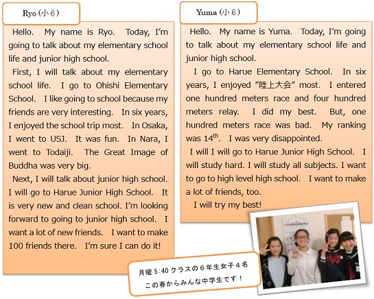 もうすぐ卒業を迎える小学6年生。水5:35と土11:20クラスの生徒たちには、卒業スピーチを書いてもらいました。中学への意気込みが見られますね!